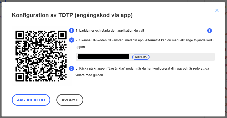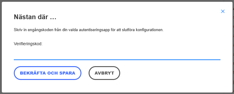 5. Ange engångskoden från appen och klicka på Bekräfta.