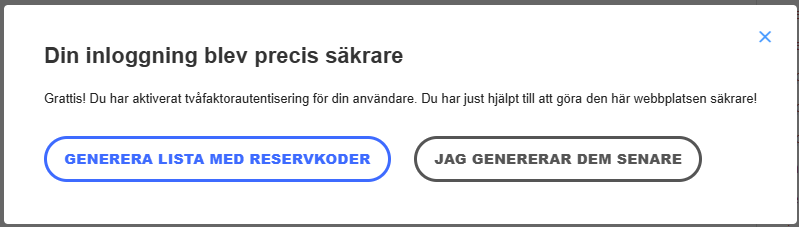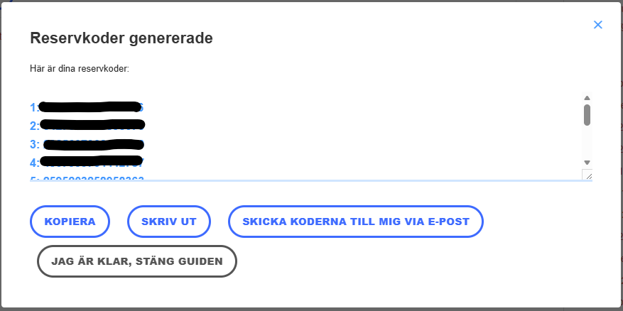 6. Du får sedan möjlighet att skapa reservkoder för inloggning om du inte har tillgång till mobilen. Vi rekommenderar att du skapar och sparar dessa.